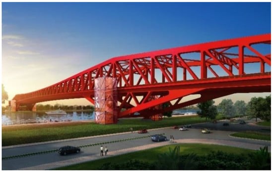 The Sanguantang bridge (as shown in Figure 4) and its connection project are located in the east of Ningbo City. It is the main crossing in Jiangtong, connecting the Academician Road of the High-tech Zone and Zhenhaiming Avenue. It starts from the Jiang Road that has been built in the high-tech zone in the south, and connects with the existing high-tech zone in the south of Zhenhai. The Jiang Road in the north is connected to the west of the current state of Zhenhai in the north. The total length of the route is 3300 m, crossing the Yongjiang River and four planned rivers. The bridge project mainly includes the main bridge spanning the Yongjiang River, the connecting approach bridge on the south bank of the Yongjiang River, the connecting approach bridge on the north bank and the ground bridge. The total length of the main bridge is 2203 m.