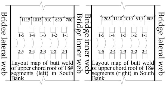 The residual stress detection sections of the upper chord butt weld of the main truss of the steel truss girder bridge are 17#,18#,19#,20# sections on the north bank and 18#,19#,20# sections on the south bank. After the stress detection of the butt welds of the above-mentioned segment roofs, the stress-relief treatment was carried out by selecting the areas with greater stress according to the stress detection results and using the high-energy ultrasonic method. For the segment that needs stress relief, the stress relief point is at the same position as the weld stress detection point. Taking 18# weld as an example, the measuring point layout is shown in Figure 5.