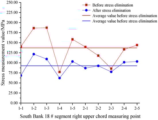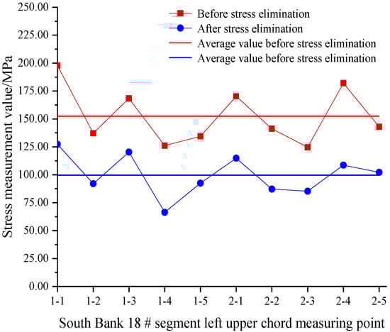 Comparison before and after the welding residual stress of the upper chord on the left side of the 18# segment of the south bank.