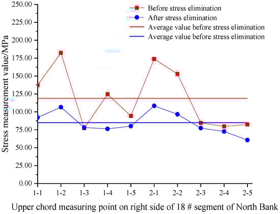 Comparison before and after the welding residual stress of the upper chord on the right side of the 18# segment of the north bank.
