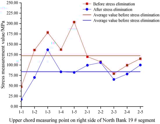 Comparison before and after the welding residual stress of the upper chord on the right side of the 19# segment of the north bank.