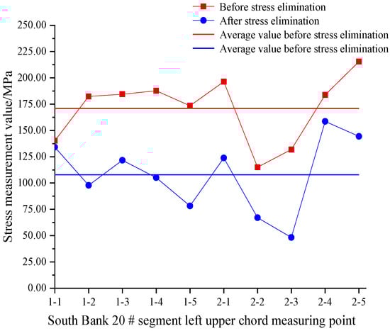 Comparison before and after the welding residual stress of the upper chord on the left side of the 20# segment of the south bank.