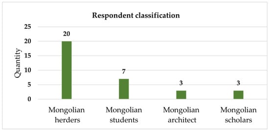 At present, only a few areas in Inner Mongolia, such as Bayanwindur Sumu, Zarut Flag, and Ulagai in Tongliao City, still retain nomadic life. The yurt residence in the summer camp of Zalut Banner was selected for observation and participatory life surveys. The “original data” of surveying and mapping and interview data were obtained to recognize the current situation and changes of Mongolian herders’ living in a modern context. During the survey process, we interviewed 33 respondents between 20 and 71 years old, 7 women and 26 men. According to their familiarity with yurts, 27 interviewees with yurt living experience were selected, and 6 interviewees had a certain degree of understanding and research on yurts. Those interviewees had different identity backgrounds, including 20 Mongolian herders, 3 Mongolian scholars, 3 yurt-related research architects, and 7 Mongolian students (one is a student from Mongolia), as shown in Figure 1.
