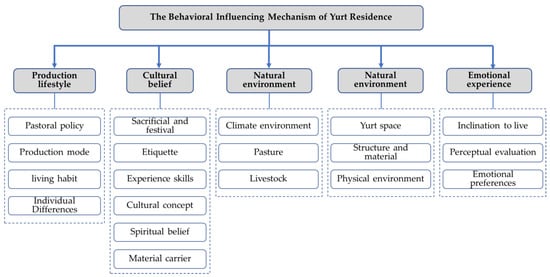 In terms of residential behavior in yurts, residential characteristics and the natural environment are external factors in objective sense, and emotional experience and cultural belief are derived from the interior factors of ideology and value concepts, both through behavioral activities.