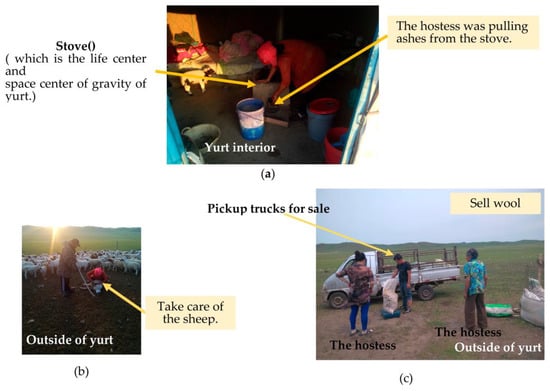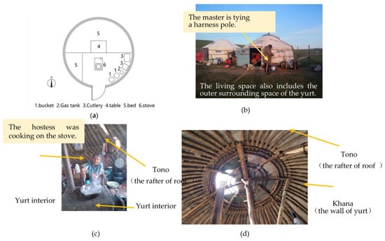 The space attributes of the yurt are the adaptation of Mongolian nomadic life and living habits for thousands of years to the environment and including space scale, space layout, space quality, and order. The scale is appropriate, single and complete, facilitates communication, and has clear divisions. Zhaola (a 21-year-old Mongolian herder) said: “The round shape in our Mongolian [yurts] means unity and cohesion”, as shown in Figure 6a–c.