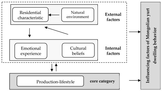 In the structural relationship diagram of the five main categories, production-lifestyle is the core category, in which internal factors include cultural belief and perceptual experience; external factors include residential characteristics and physical environment. These categories constitute the main factors affecting the yurt residence behavior. The relationship between the main categories is shown in Figure 7.