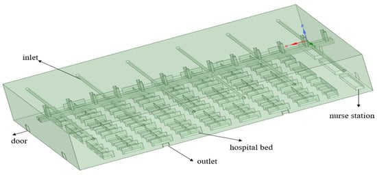 23] conducted a simulation study in the sickbed area of the Wuhan Dahuashan Fangcang Shelter Hospital. The phenomenon of thermal stratification and poor ventilation increased the risk of infection due to the accumulation of pollutants exhaled by patients, and baffles were used to solve the air seepage velocity near the make-up air inlet. Following China’s successful experience in building Fangcang shelter hospitals, other countries began to establish Fangcang shelter hospitals and carry out research. For example, the 627th field hospital in the United States transformed from the activity center, the Garvitz field hospital transformed from the conference center, and the Spanish Madrid shelter hospital transformed from the convention center [
