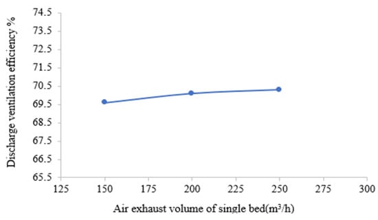 (2) The exhaust efficiency represents the efficiency index of pollutants discharged. This paper simulated the problem of pollutant emission efficiency by increasing the exhaust air volume. Through the analysis of simulation results, it was concluded that the dilution degree of pollutants grew with the increase in exhaust air volume, but the growth rate was slowed down with the increase in exhaust air volume. When the exhaust air volume is increased from 150 m3/h to 200 m3/h, the ventilation efficiency is increased by 0.5%. The ventilation efficiency increased by 0.2% from 200 m3/h to 250 m3/h, which means that with the increase in exhaust air volume, the discharge of pollutants cannot be effectively increased. In addition, the increase in exhaust air volume would produce a strong sense of blowing when the wind speed was greater than 0.3 m/s for the height of personnel activities. In the case of comprehensive consideration of pollutants’ discharge efficiency and airflow organization, the single bed exhaust air volume of 150 m3/h is optimal, which can effectively avoid the impact of a blowing feeling on patient comfort and ensure the ventilation efficiency reaches 69.6%.