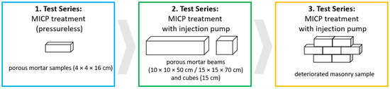 The precipitated calcium carbonate can be used to reduce porosity and thus increase the durability of deteriorated building components. In addition, MICP injection into the masonry joints could achieve a sealing effect. MICP is considered to be sustainable and offers many advantages. In contrast to conventional polymer-based grouts, only mineral precipitates are transferred into the structure with the MICP method and could therefore also be suitable for use in listed buildings. Another advantage is the high groutability of the liquid MICP reagents, which ensures an optimal distribution of the material in the building. However, the formation of ammonium by-products of the MICP process may have a detrimental effect on the component. A number of studies have been conducted to investigate MICP injection methods for application in soil improvement with soil column experiments [6,7]. However, there is still a huge demand for research on proper injection methods which achieve an effective CaCO3 distribution [8]. Some studies have already focused on possible MICP applications on bricks, stones or masonry [4,9,10,11,12]. Jimenez-Lopez et al. [12] developed biomineralization experiments by activated bacteria inhabiting the stone for consolidation and increasing the resistance to the deterioration of stone pieces. Le Métayer-Levrel et al. [13] were able to achieve a surface improvement of limestone façades which led to a reduction in water absorption. Moreover, Tiano et al. [14] and De Muynck et al. [15] induced a decrease in stone porosity with MICP surface treatment. However, so far, the application of an MICP injection method on structures has hardly been researched. In the studies by Yang et al. [2,16], field tests were presented to reinforce deteriorated historic masonry structures. Bacterial culture and cementation solution were pumped into sand-filled boreholes for more than 2 weeks. A visual evaluation showed that the formed biomediated sandstone could be a promising approach for masonry improvement. The precipitated CaCO3 is able to close pores and increase the density of the components [17]. The MICP application in cementitious materials, however, still offers research potential [18].