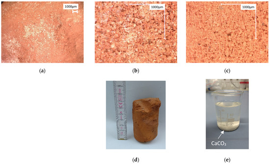 Microscopic evaluation of drilled core samples: (a) Detail from the inside surface of the packer borehole after the MICP injection; (b) Detail of the masonry pores partly filled with MICP; (c) Detail of the outer surface of the drilled core sample with masonry pores without traces of MICP. Drilled core sample from a MICP-injected area (d) and MICP reagents collected in beaker with precipitated CaCO3 (e).