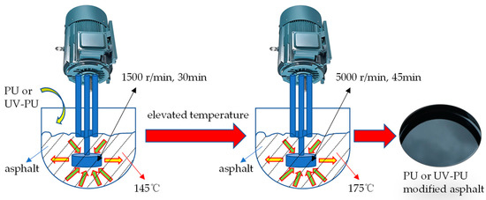 The preparation process of PU modified asphalt and UV-PU modified asphalt is as follows: a certain amount of modifier is added to asphalt at 145 °C, cut at a shear rate of 1500 r/min for 30 min. Then the temperature is raised to 175 °C, and the asphalt is cut at a rate of 5000 r/min for 45 min to obtain PU modified asphalt or UV-PU modified asphalt. In this paper, the content of PU or UV-PU is both 5% of the mass of asphalt. Figure 1 shows the preparation process.
