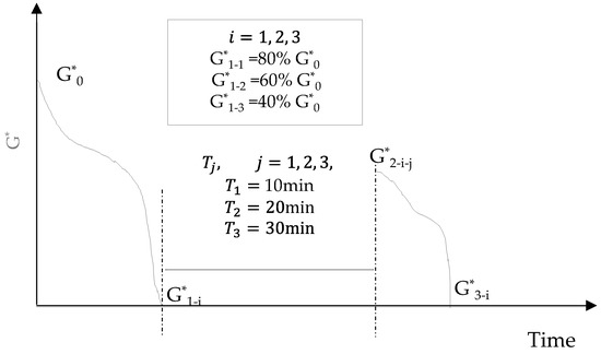 The 70# asphalt and PU or UV-PU were used to prepare the PU or UV-PU modified asphalt, the time scanning was performed on the asphalt using a dynamic shear rheometer (DSR). The control mode was strain control, with a loading frequency of 10 Hz, strain control of 10%, the thickness of asphalt was 2 mm, and loading temperature is 20 °C. The test was conducted by loading, healing, and loading methods. When the loss values of the asphalt complex modulus (G*) reached 20%, 40%, and 60%, the loading was stopped. Then, the asphalt was given healing times of 10, 20, and 30 min, respectively. G* was tested separately, as shown in Figure 2, the healing status was evaluated according to Equation (1). The same test also applies to SBS Ι-C and 70# asphalt.