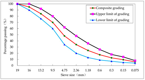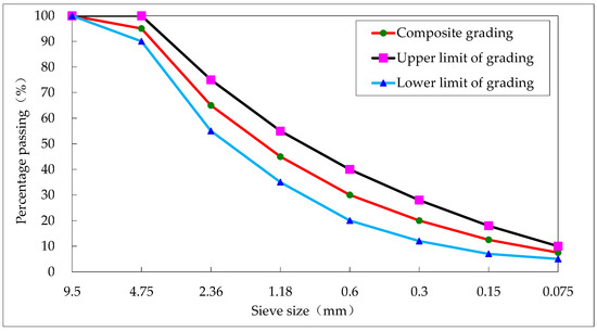 The 70#, SBS, PU, and UV-PU modified asphalt and aggregates were used to prepare sand-type asphalt mixture AC-16 rutting board, respectively. The grading of AC-16 is shown in Figure 5. After 24 h of free cooling of the rut board, the cutting machine was used to prepare a size 380 mm × 50 mm × 63 mm small beam specimen.