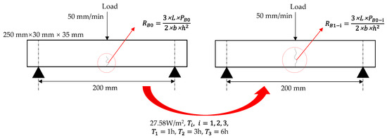 According to “Standard Test Methods of Bitumen and Bituminous Mixtures for Highway Engineering (JTG E20-2011)”, the bending test was conducted at 15 °C, the load at which the specimen undergoes failure cracks was recorded, and the flexural tensile strength () was calculated. Then turn on the fluorescent lamp to irradiate the specimen at an intensity of 27.58 W/m2 for 1 h, 3 h, and 6 h, respectively, to promote crack healing. The fluorescent lamp simulates the full band of sunlight, including UVA (8.5%), UVB (0.2%), visible light (43%), and infrared light (48.3%). Then repeat the low-temperature bending test to obtain the load at which the failure crack occurs again and calculate the flexural tensile strength (), as shown in Figure 4, and evaluate the healing of the asphalt according to Equations (2)–(4).