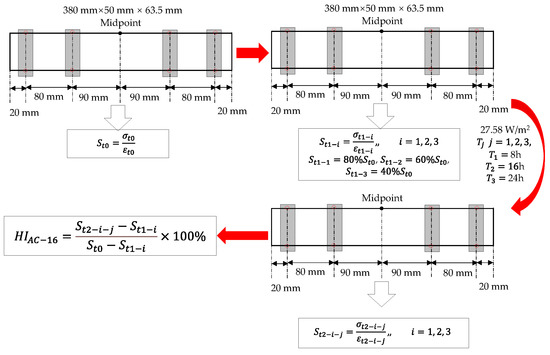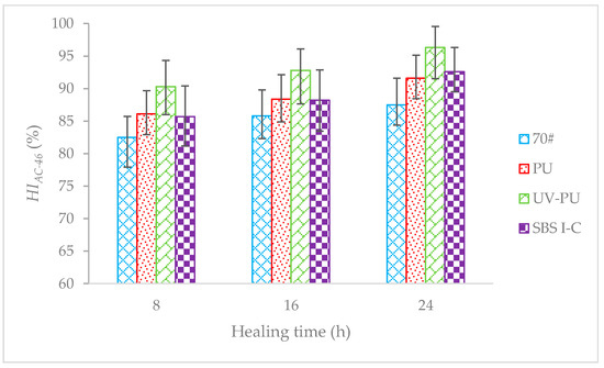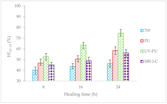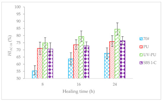 The 60% loss of S was used as the test reference condition, and specimens were irradiated with a fluorescent lamp with an irradiation intensity of 27.58 W/m2 for 8 h, 16 h, and 24 h to promote healing. Then, a bending fatigue loading test was conducted again to test and calculate the HI of AC-16. Figure 14 shows test results.
