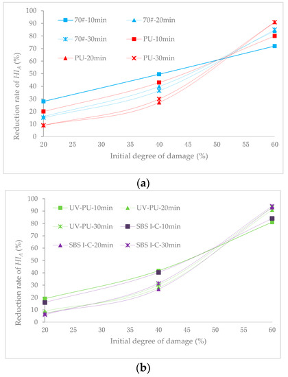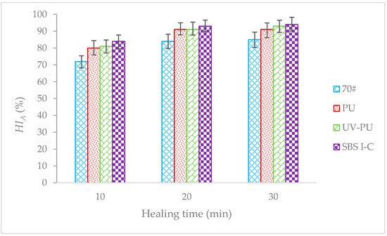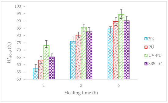 Figure 11 shows that under the same light healing time, there is a significant difference in the HI of different types of AC-5, AC-5 with UV-PU modified asphalt significantly superior to other AC-5 types. When using the HI as an evaluation index to evaluate the SHP of AC-5, the SHP of AC-5 varies from large to small, UV-PU modified asphalt AC-5 > PU modified asphalt AC-5 ≈ SBS Ι-C-modified asphalt AC-5 > 70# asphalt AC-5. The outstanding SHP of AC-5 with UV-PU modified asphalt indicates that UV-PU modifiers play a certain role under the action of light. The mechanism is that the fluorescent lamp contains 8.5% UVA and 0.2% UVB. Under the action of these ultraviolet lights, the chitosan ring inside the UV-PU will open and generate free radicals, which can bond with the free radicals generated during loss to achieve self-healing.