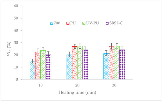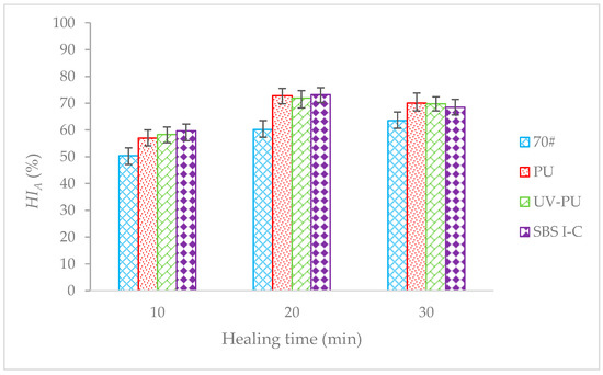 The PU and UV-PU modified asphalt with a content of 5% were prepared. Different types of asphalt were conducted DSR time scans. Due to the inability to apply light to the asphalt during the DSR test, only the asphalt type and the healing time are analyzed in the testing of asphalt healing performance. Figure 7 shows the test results of asphalt with a 20% loss of G* under different asphalt types and healing times.