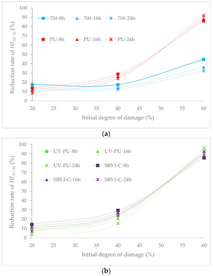 Relationship between HI loss and initial loss degree, (a) 70# asphalt and PU modified asphalt; (b) UV-PU modified asphalt and SBS Ι-C modified asphalt.