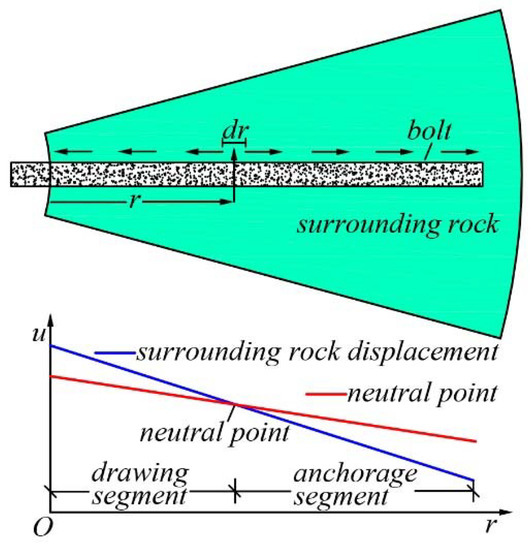 As tunnels undergo excavation, stress redistribution prompts the surrounding rock to displace toward the tunnel. Following the installation of bolts within the surrounding rock, deformation is constrained by the bolts. Deformation is significant near the cavity wall and gradually decreases with increasing distance until reaching a point of no deformation. Consequently, after anchoring, shear stress pointing toward the cavity wall is transmitted to the bolt through the bonding material between the surrounding rock and the bolt at one end near the cavity wall. In contrast, at the other end far from the cavity wall, the bolt experiences shear stress directed away from the cavity wall. The bolt body is subject to opposing shear stresses, and a neutral point with zero shear stress emerges at a specific location along the bolt. The bolt segment extending from the cavity wall to the neutral point is referred to as the drawing segment, whereas the portion from the neutral point to the far end of the cavity wall is known as the anchorage segment, as depicted in Figure 1.