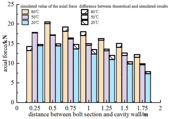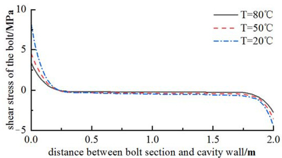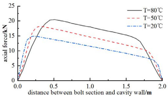 At a temperature of 20 °C, the shear stress of the anchorage body interface reached its highest value, peaking at 8.1 MPa, whereas the maximum axial force of the bolt was 17.9 kN, which occurred 0.28 m from the cavity wall. In contrast, at 80 °C, the shear stress reached its minimum, measuring only 3.4 MPa, which is only 42% of that at 20 °C. The bolt experienced a maximum axial force of 22.3 kN, 25% greater than the value at 20 °C, and the force occurred at a distance of 0.34 m from the cavity wall. As the temperature increases, the bonding ability between the bolt and the surrounding rock weakens. Consequently, the maximum shear stress value at the cavity wall decreases, the position of the neutral point moves away from the cavity wall, the length of the drawing segment increases, and the axial force of the bolt increases. Therefore, high-temperature environments require bolts with greater strength.
