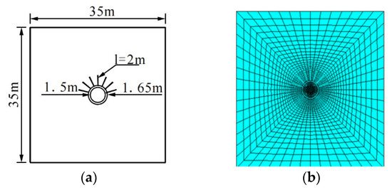 In order to validate the theoretical analysis, a comparative analysis was conducted using ANSYS numerical software. After tunnel excavation, the surrounding rock’s displacement and stress increased as it approached the cavern, and the influence range was three to five times the cavern diameter. Considering that the bolt will also disturb the surrounding rock during support, the calculation range was set to three times the length of the bolt plus the cavern diameter (35 m × 35 m). Displacement in the X direction constrained the model’s left and right boundaries, whereas displacement in the Y direction constrained the lower boundary. The surrounding rock adopted the elastic–plastic constitutive model and the D–P yield criterion, and the other material parameters remained the same as in Case 1.