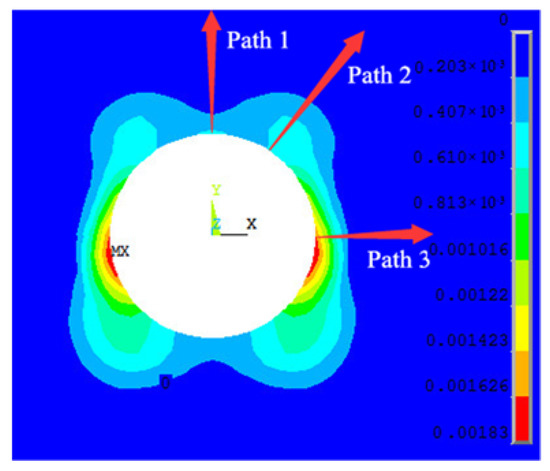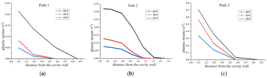 At simulated temperatures of 20 °C and 50 °C, the maximum axial force of the bolt occurred at 0.25 m, with values of 17.74 kN and 14.47 kN, respectively. When the temperature reached 80 °C, the maximum axial force was 20.09 kN, occurring at 0.5 m. As the simulated temperature increased, the drawing segment of the bolt lengthened, and the neutral point moved away from the cavity wall, which is consistent with the results obtained from the theoretical analysis. These findings validate the computational model’s accuracy in this paper. Furthermore, the simulated axial force values of the bolt align with the theoretical values, with a maximum difference of 7.7%, which is within an acceptable range. The difference between the two values may be due to the fact that the theoretical analysis only considered the effect of temperature change on the physical properties of the surrounding rock and anchoring structure. Conversely, the numerical simulation accounts for the impact of temperature stress caused by temperature change. However, temperature stress minimized the bolt’s stress at normal and low temperatures, but significantly impacted the stress at high temperatures. Additionally, temperature stress is a secondary influencing factor under different temperature conditions. Figure 9 displays the plastic strain paths, whereas Figure 10 illustrates the plastic strain variation in different paths.