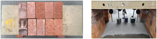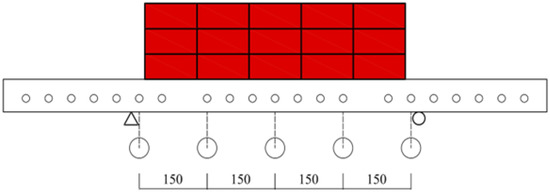 According to the static test requirements in the Aluminum Alloy Formwork, AAFs of Xinjiang Changhedaye Construction Technology Co., Ltd. with a selected specification of 1200 mm × 500 mm were used for the test. The standard brick was used as the support and load in the test. The bearing distance wass 225 mm from the outer wall of the end rib, and the width of the bearing was 115 mm. Five displacement meters for measuring deflection were equidistant between the two supports on the bottom surface of the AAF (see Figure 1). A rubber mat was placed in the center of the formwork and standard brick was placed on top of the rubber mat. A total of 30 standard bricks placed in 3 layers were of first-level load, with a total of fifth-level load, as shown in Table 1. After loading each level of load, the system was left to stand for 20 min, and the value on the displacement meter was then read after the deformation of the formwork.