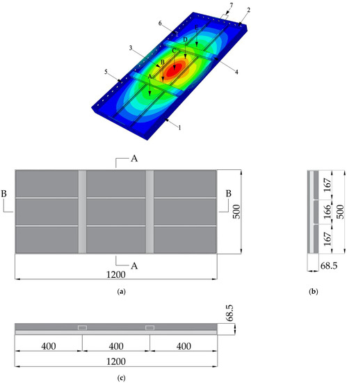 AAF in ABAQUS (in mm): 1—side rib; 2—end rib; 3—longitudinal rib; 4—transverse rib; 5—pin hole; 6—pin hole height; 7—pin hole spacing; (A)—measuring point A; (B)—measuring point B; (C)—measuring point C; (D)—measuring point D; (E)—measuring point E; (a)—top view of aluminum alloy formwork; (b)—A-A sectional drawing; (c)—B-B sectional drawing.