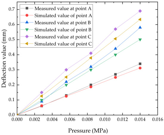 The comparison between the deflection values of the test and simulation results shows that the deflection errors of the test and simulation results at the measurement points A, B, and C are all within the range of 14%. From Figure 3, it can be seen that the simulated deformation and the actual deformation trend are basically the same. Therefore, the simulation in this study is feasible, and the simulation results are highly reliable.