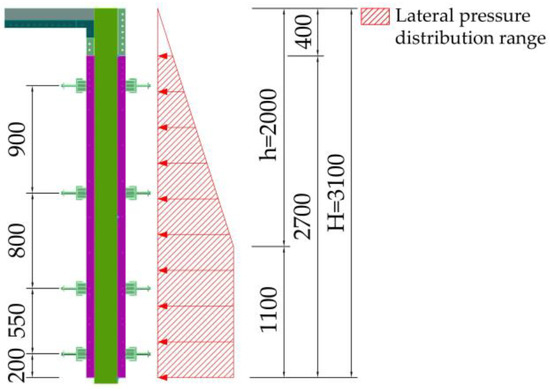 The lateral pressure of concrete on the AAF increases with the height of the concrete pour. When the pour height reaches a critical value, the lateral pressure no longer increases, reaching the maximum lateral pressure for the newly poured concrete. The maximum pour height at which lateral pressure is reached is called the concrete’s effective pressure head. Referring to the specifications [28,29], when using an internal vibrator, the lateral pressure of the newly poured concrete on the AAF can be calculated using Formula (2), choosing the smaller value.