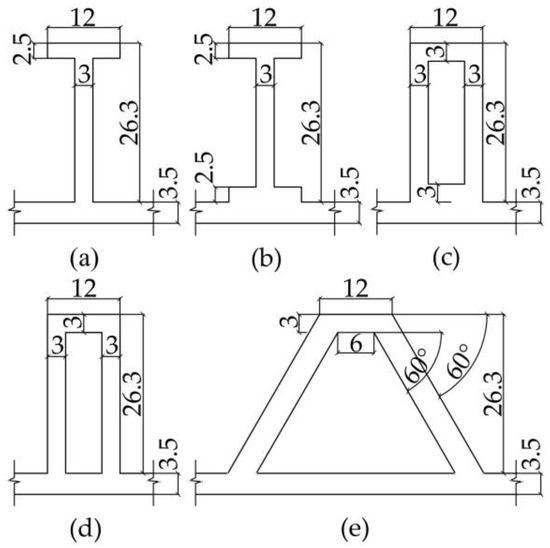 The longitudinal ribs can transfer the load from the panel to the end ribs, and then from the pin holes of the end ribs to the pins and pin pieces. According to the literature [37], it is known that the number of longitudinal ribs is set to two. Referring to the specifications [26,35], there are five types of longitudinal rib section shapes used in this numerical simulation. Figure 5 shows the detailed configuration of the shape of the longitudinal rib sections.