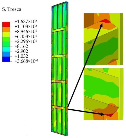According to the data analysis results in Table 6, increasing the thickness of transverse rib walls can significantly improve the flexural stiffness of the formwork. Increasing the thickness of transverse rib walls from 1.5 to 3.5 mm in an increment of 0.5 mm results in the maximum deflection of the panel being reduced by 9.19%, 15.99%, 20.93%, and 24.63%. At the same time, the stress of the AAF is mainly concentrated in the weld of the transverse ribs and side ribs, as shown in Figure 6. Increasing the thickness of transverse rib walls can increase the welding area between the transverse ribs and side ribs, making the connection firmer and reducing the stress concentration of the AAFs at the welding of the transverse and side ribs. It can be seen from the above analysis that increasing the thickness of transverse rib walls has a great influence on improving the flexural stiffness of the formwork and reducing the maximum deflection of the panel.