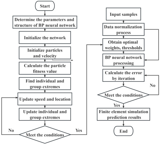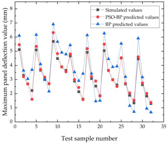 The six factors of the orthogonal test were used as the initial training parameters, and the BP neural network model and PSO-BP neural network model were used for training and testing, respectively. The prediction results of the BP neural network model and PSO-BP neural network model were obtained and compared with those of the finite element simulation, and the results are shown below.
