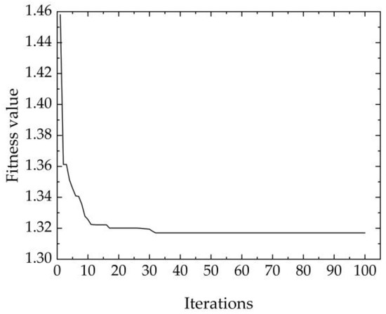 The PSO algorithm program was written and run using MATLAB software, with the results showing improved global convergence and convergence speed, and the global optimum sought by the particle gradually converged to the theoretical optimum as the number of iterations increased [46]. After 100 iterations of searching in optimization, the optimal individual fitness value of the PSO algorithm changed, as shown in Figure 10.