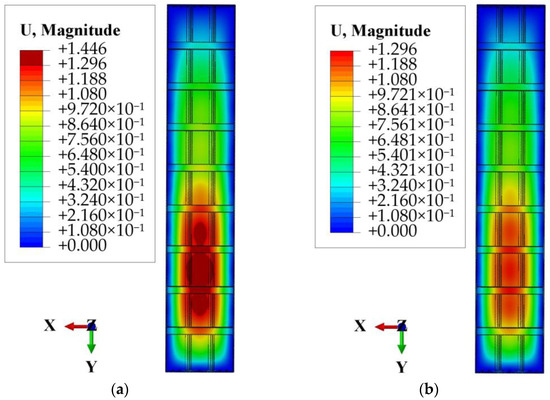 Five different thicknesses were selected for the panel. The geometric parameter settings and finite element calculation results are shown in Table 4. The results show that when the panel thickness increases—that is, the rectangular section height of the panel increases—the bending stiffness of the AAFs can be effectively improved, and the maximum deflection value of the panel can be reduced. Therefore, the change in the panel thickness of the formwork has a greater influence on the deflection value and flexural stiffness of AAFs.