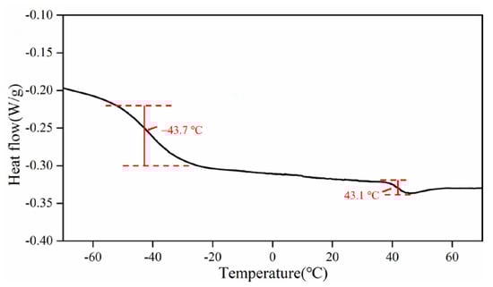 The glass transition temperature is the lowest temperature of polymer chain segment movement. The more flexible the molecular chain is, the lower the glass transition temperature is. The more rigid the molecular chain is, the higher the glass transition temperature is [35]. The DSC curve of polyolefin elastomer is shown in Figure 2.