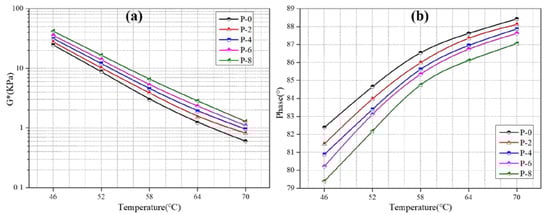 Additionally, Figure 5 shows that the introduction of polyolefin improves the complex modulus of asphalt but weakens the phase angle of asphalt. In other words, the resistance of the modified binders to permanent deformation is improved. For example, the complex modulus values of the modified binder with 8% polyolefin at 46 °C, 52 °C, 58 °C, 64 °C, and 70 °C are 17,400 Pa, 7739 Pa, 3539 Pa, 1613 Pa, and 685 Pa higher than that of the virgin asphalt, respectively. This difference may be caused by the crosslinking of polyolefin elastomers in virgin asphalt. In short, the introduction of polyolefin changes asphalt from viscous to elastic, which helps improve the asphalt’s resistance to deformation at high temperatures.