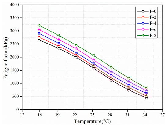 Figure 7 demonstrates that the fatigue factor of all specimens decreases with increasing temperature, indicating that the risk of fatigue cracking of asphalt pavement is smaller under high-temperature environments. However, it can be observed from the figure that, at the same temperature point, the fatigue factor of the polyolefin-modified binder is larger than that of virgin asphalt, suggesting that introducing polyolefin compromises the anti-fatigue ability of the asphalt to some degree. This compromise can be explained by the fact that the rigid chain in polyolefin improves the stiffness of virgin asphalt and damages the flexibility of asphalt, to a certain extent. Nevertheless, due to the existence of relatively flexible rubber chain segments in polyolefin, the influence of polyolefin elastomer on the fatigue property of asphalt is very weak at a low dosage. However, it also found that the fatigue factor of modified asphalt increases with the amount of polyolefin. Consequently, strict control the amount of polyolefin in asphalt is recommended to ensure that the modified asphalt has qualified fatigue resistance.