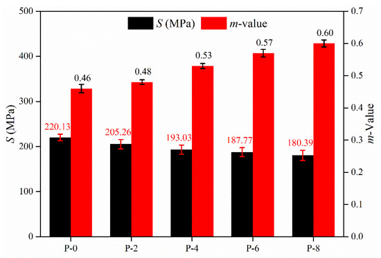Brittle cracking is the dominant damage form of asphalt pavement in high latitude areas. As a result, it is of great practical value to enhance the low-temperature performance of asphalt pavement to reduce the maintenance frequency of roads in cold areas. In this study, the cracking resistance of all modified asphalt samples at low temperatures was measured through a bending beam rheometer. Two key parameters, namely creep stiffness modulus (S) and creep rate (m-value), were obtained by the experiment. In general, the smaller the S value is, the larger the m-value is, and the better the low-temperature cracking resistance of asphalt is [40]. Figure 8 indicates the experimental results of all modified asphalt binders at −12 °C. The errors of the parallel experiments for each sample were within reasonable limits. It can be observed from Figure 8 that under the same test temperature, the S value of polyolefin-modified asphalt is inferior to that of original asphalt, while the m-value of polyolefin-modified asphalt is greater than that of original asphalt. The S value and m-values of P-8 are 0.82 and 1.30 times those of virgin asphalt, respectively. This finding illustrates that polyolefin elastomer improves the low-temperature behavior of asphalt. The first glass transition point of polyolefin is around −43.7 °C according to the previous DSC experimental results, which means that the uncrystallized ethylene and octene in polyolefin are still in a soft rubber state under the BBR test temperature. The flexible polymer chain allows the asphalt to disperse impact energy when impacted, which reduces the chance of cracking. Consequently, polyolefin elastomer can extend the service life of asphalt pavement in cold areas, to a certain extent.