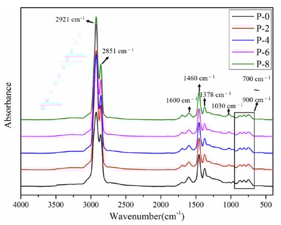 The experimental results of the infrared spectrum of all specimens in this study are displayed in Figure 9. All curves presented are reproducible. Seven obvious absorption peaks can be observed in the wave number interval from 400 cm−1 to 4000 cm−1. The characteristic peaks at 2921 cm−1 and 2851 cm−1 are induced by stretching vibration of −CH3 and −CH2 [41]. The absorption peak observed at 1600 cm−1 is caused by the vibration of the benzene ring C=C skeleton [42]. The absorption peaks at 1460 cm−1 and 1378 cm−1 are related to the bending vibration of −CH. The absorption peak at 1030 cm−1 is closely related to the S=O bond in asphalt [43]. The absorption band at 700~900 cm−1 of the fingerprint area is induced by the bending vibration of the C−H on the benzene ring. The characteristic peak of polyolefin-modified asphalt is almost the same as that of virgin asphalt, only the absorption peak intensity is slightly different. In addition, no fresh characteristic peaks can be observed from the infrared spectrum of polyolefin-modified asphalt. Therefore, it may be concluded that polyolefin elastomers do not affect the chemical properties of virgin asphalt, and mechanical blending is the main mode of interaction between them.
