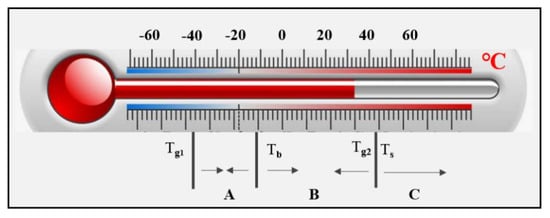 In polyolefin, the crystallized ethylene segment (rigid structures) and the uncrystallized ethylene and octene (flexible structures) are two-phase structures, resulting in two glass transition points at −43.7 °C (Tg1) and 43.1 °C (Tg2), which has been verified in the DSC experiment. Meanwhile, asphalt was classified into three sections, namely brittle, flexible, and viscous states, using the brittle point (Tb~11.0 °C) and softening point (Ts~49.7 °C) as dividing points. To understand more clearly the enhancement mechanism of polyolefin elastomer on virgin asphalt, Tg1 and Tg2 of polyolefin elastomers are labeled on the temperature axis, as well as Tb and Ts of virgin asphalt in Figure 10. Since the Ts of virgin asphalt is close to the Tg2 of polyolefin, the above two temperature points are labeled at the same position in Figure 10.