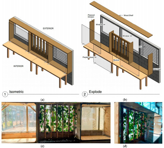 (a) Isometric modeled image of the experimental set-up showing all the components, and exterior and interior environment. (b) Exploded view of the components of the experimental set-up. The model was designed and drafted in Autodesk Revit. (c) Experimental set-up showing three modules (NC, GC, and WB). Each section of the GC can be vertically rotated. The fully grown Philodendron cordatum plant is included on each section of the GC module. The hemp mesh running from top to bottom provided a climbing medium for the plant. (d) A 3D view of the plexiglass sheets in front of the modules. The external side of the modules is the glasshouse mimicking the Australian outback region climate. Detailed dimensions of the GC prototype and the experimental setup are shown in Appendix A (Figure A1 and Figure A2).