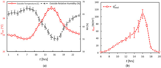 The experiment started in November 2021. It was the sixth wettest year on record, with 2021 rainfall being 30% above average. Sydney had its wettest November since national records began in 1900 [65]. It was not a hot summer. The external ambient mean hourly values with error bars of the outdoor temperature and relative humidity are shown in Figure 4.
