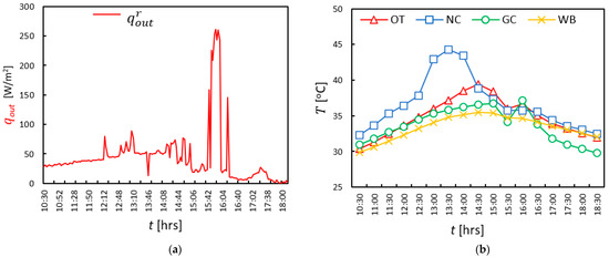 Figure 5b shows the temperature recorded for every 30 min on 1 February during the solar radiation hours. The outdoor temperature is directly correlated to the solar radiation; e.g., from 18 January–22 January, 90% of the values of solar radiation were below 100 W/m2 and the mean outdoor temperature during that period was 27 °C, which is 3 °C less than its mean temperature (30 °C) during January. It is important to note that Figure 6 shows a pattern of three different time frames: (i) the rise towards the peak temperature; (ii) the peak temperature hours; and (iii) the fall of temperature after the peak has passed. The peak hours graph kept on changing monthly; e.g., in November, the peak hours were between 13:30–15:00 hrs, in December 13:00–16:30 hrs, January 13:00–16:30 hrs, February 12:30–15:30 hrs, and March 12:00–15:00 hrs. High-temperature peaks were noticed in the NC module from late spring (November) to late summer (February). The primary peak (27.5 °C) occurred around 15:00 hrs in late spring (November) and slightly late in early summer (December) at 16:00 hrs (31 °C). However, a secondary peak (30 °C) was also noticed in early summer at around 13:30 hrs. In the mid-summer (January), two primary peaks were noticed at 13:30 hrs and 16:30 hrs, with temperatures of 33.5 °C each, respectively. During the peak hours, the GC always had a minimum value compared to the NC and was the quickest to cool when the peak was passed. It was primarily because of the evapotranspiration effect of the plants [67] in the GC module. This cooling-down effect after peak hours was also noticed in other studies [45,49,68]. The main reason that the peaks were found in the NC module the most was the entrapped heat being generated due to the greenhouse effect [69]. As the WB was blocking most of the solar radiation, therefore, understandably, it had the minimum indoor temperature before and during the peak hours. However, due to some radiation still penetrating through the blinds, the entrapped heat inside the WB module increased the temperature.