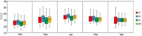 From the box plot data shown in Figure 7, it is important to note that the mean value (x) and the median line are at the lowest in the GC module from late spring (November) to late summer (February). This shows the overall performance of the GC prototype to regulate the indoor temperature inside the module and keep it around or within the ASHRAE range. The evapotranspiration effect [67] of the GC causes this cooling effect inside the module. Moreover, on an average hourly basis, GC is 1.3 °C and 0.6 °C cooler than NC and WB, respectively. This can be verified by a meta-analysis study of green spaces [71]. WB had the lowest average maximum daily temperature, followed by GC and NC; this can be explained by the reflection of the solar radiation. However, some radiation still comes inside the WB and the heat then gets entrapped as with NC. Therefore, this entrapped heat in the form of high thermal mass [72] does not allow the WB and NC to get low quickly, compared to GC which had plants.