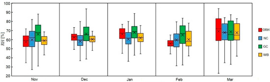 The RH data are shown in Figure 8. GC had the highest RH in all the modules from late spring (November) till late summer (February). On a daily average basis, in late spring (November), the RH of GC was greater than OT, NC, and WB by 9%, 6%, and 7%, respectively. In the summer months (December, January, and February), this difference was 3.62%, 7.2%, and 5.72%. The high RH values of GC were due to transpiration, as the water travels from the root to the plant leaves, where it turns into water vapor and is released into the atmosphere [68]. Therefore, green plants can increase indoor relative humidity [74] and also regulate air temperature [75]. The minimum values were all recorded in the afternoon because the cooler morning air is closer to saturation than the hot afternoon air, even with the same amount of water vapor. The season shift from late summer to early autumn lowers the RH in GC and the difference is 1% approximately each between GC,NC and GC,WB. In March, the rise in RH values is due to the dip in the external and internal temperatures [76], as the weather becomes cooler, causing the air to be moist.