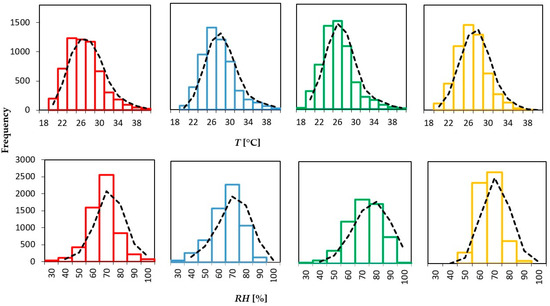 The frequencies of the temperature and relative huimidities inside the modules with moving average lines (black dotted) shown in black. The horizontal axis lines show a certain range of temperature and RH. The vertical axis line shows the frequency of occurrence of temperature and RH.