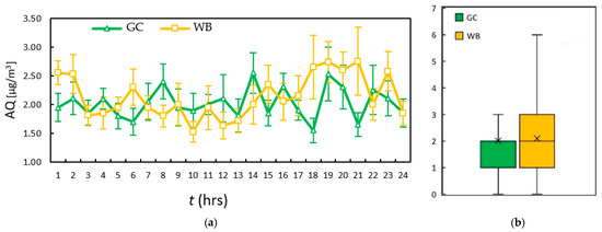 (a) Hourly mean data of AQ for GC and WB modules. The error bars were calcualted using standard error (SE); formula: SE = Standard Deviation/√ (sample size). These mean data were calculated from the complete raw data measured every 30 min from 1 March 2022 to 21 March 2022. (b) The box plot data distribution of the AQ data. The box plot shows median (solid middle line), mean marker (×) and the interquartile ranges; the whiskers give the range of maximum to minimum, except for “outliers”.