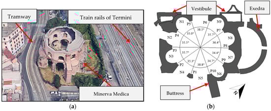 The so-called Temple of Minerva Medica is an ancient construction in the city center of Rome between the train rails of Termini station and Via Giolitti, where, in the 20th century, an important urban tramway was built (Figure 1a). The original structure was built around the 4th century A.D., and it was entirely made of opus latericium formed by a Roman concrete core of opus caementicium and two brick-masonry external layers in opus testaceum. From the beginning, the construction manifested structural problems, and it was necessary to build additional stabilizing elements (the exedras, the vestibule, and the buttresses) to counteract the outward thrust of the dome [] (Figure 1b), which is highlighted by the use of different materials and techniques (opus mixtum with rough-hewn tuff stone and Roman bricks []).
