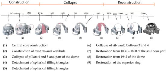 The main construction phases of the monument were identified with analysis of the archival sources, followed by direct observations on site. The historical evolution can be divided into three main periods: construction (between the 4th century and 1550), collapse (between 1550 and 1828), and reconstruction (between 1828 and 2022) []. Figure 2 summarizes the evolution of the Temple of Minerva Medica.